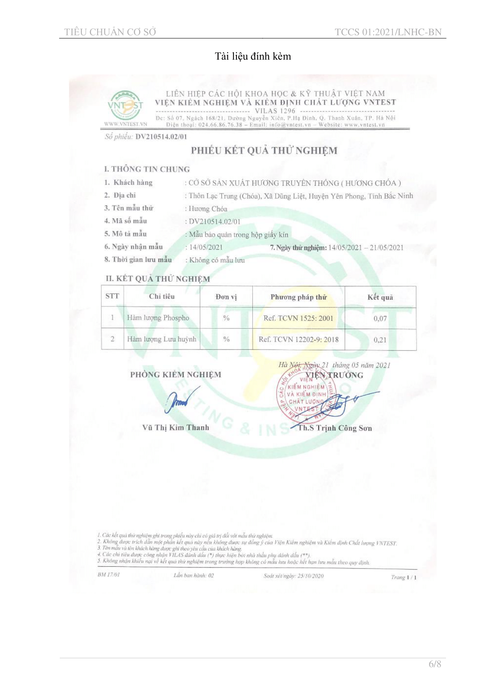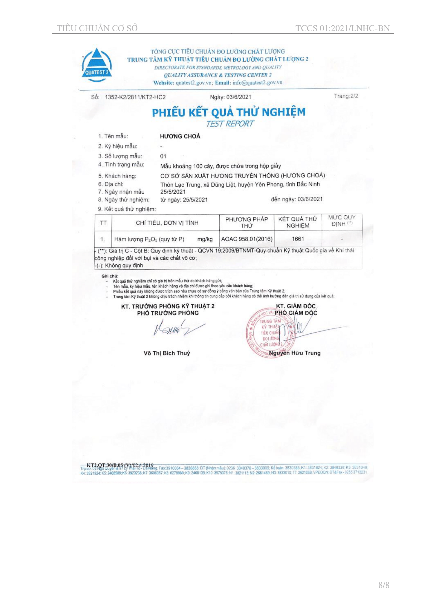 Kết quả thử nghiệm khí thải của Hương Choá đạt tiêu chuẩn an toàn theo QCVN 19:2009/BTNMT về khí thải công nghiệp đối với bụi và các chất vô cơ.